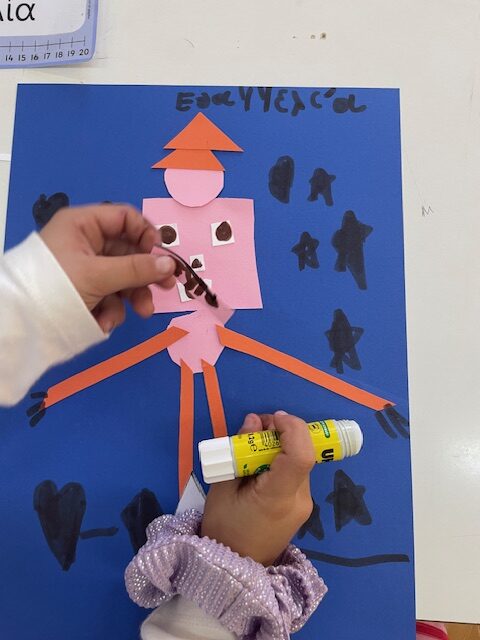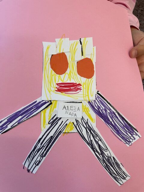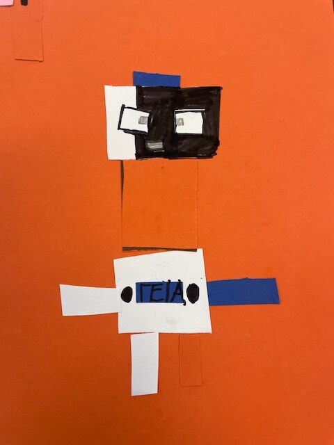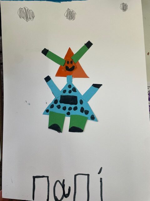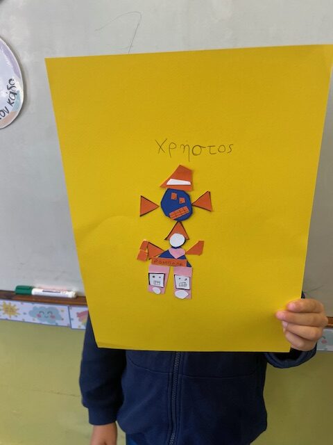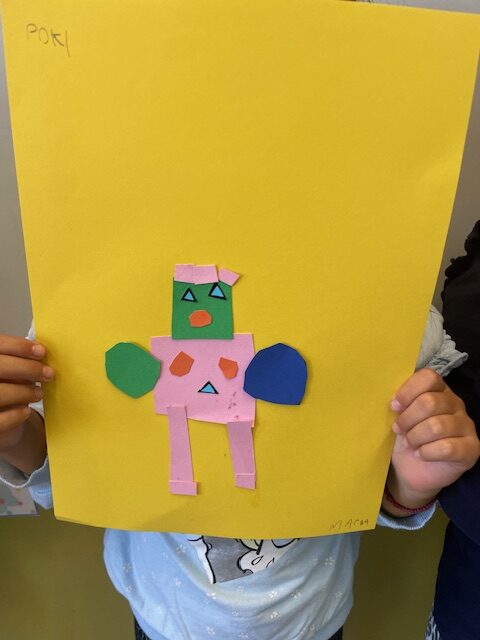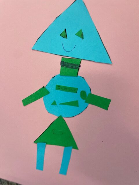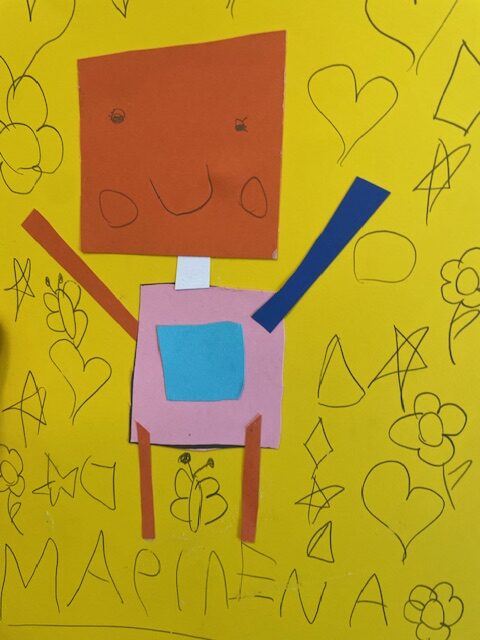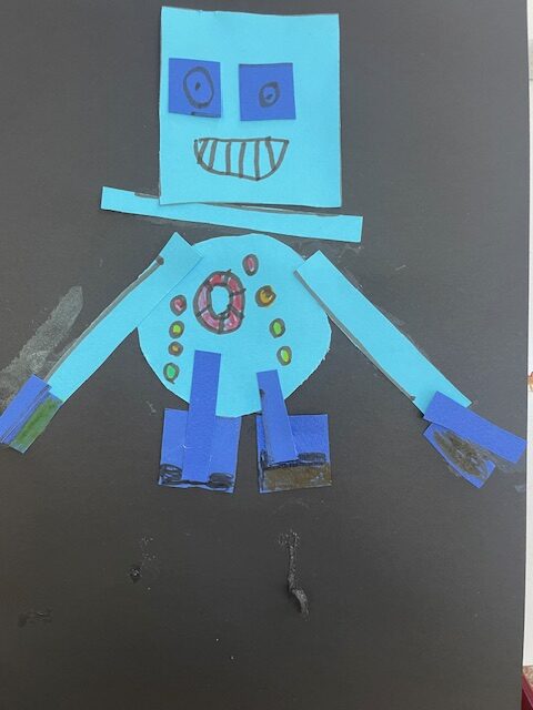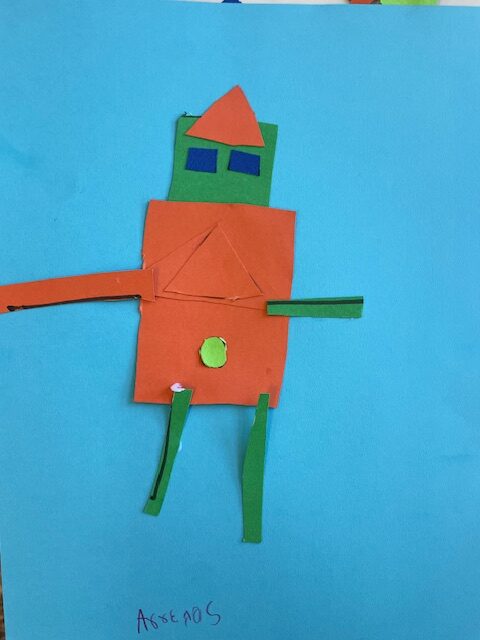 Μελετήσαμε σχήματα και χρώματα, αφού ανακαλύψαμε διάφορα πράγματα που μπορούμε να σχεδιάσουμε χρησιμοποιώντας τα σχήματα, καταλήξαμε να φτιάξουμε ένα ρομπότ. Στην αρχή το ζωγραφίσαμε και του δώσαμε όνομα. Στη συνέχεια το φτιάξαμε με χαρτόνια μαθαίνοντας να κόβουμε με το ψαλίδι μας.